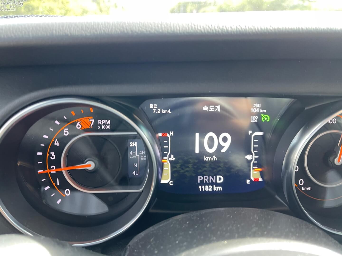 사진의 우측 상단에 보시면 거리 104km로 표기되어 있는 게 주행 가능 거리를 표시한겁니다. 저 주행가능거리를 측정하는 센서? 같은게 마치 화물차같습니다. 화물차들의 경우 오르막 경사에 정차해 있을 때 연료 게이지가 올라감과 동시에 주행가능 거리가 올라가고, 내리막 경사에 정차해 있는경우 연료 게이지가 줄어듦과 동시에 주행가능 거리가 줄어드는 현상이 나타나는데 이 현상이 랭글러에서도 나타납니다.
